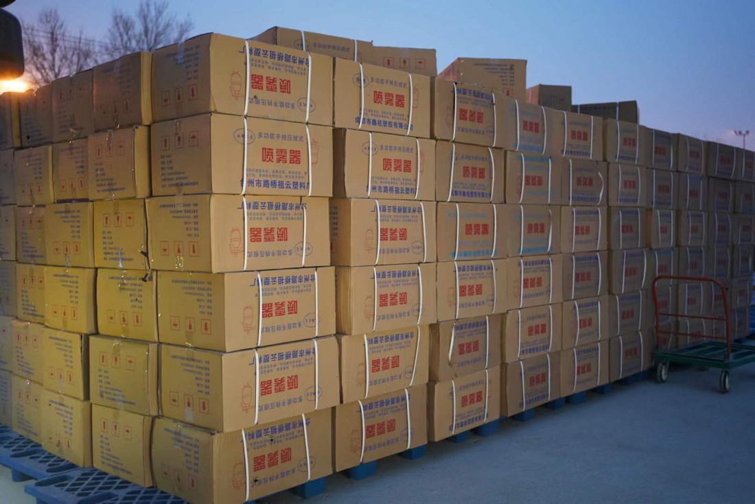 1月5日中午,10000个喷雾器整齐装箱,2500kg季铵盐消毒液准备就绪,悬挂“聚旺控股集团 助力西安抗疫”横幅的大货车蓄势待发,在一声鸣笛后,奔赴抗疫一线。当物资运输车辆到达西安市雁塔区红十字会时,集团执行总裁于红卫、副总经理索鑫与防疫工作人员齐心协力,将防疫物资搬运至指定地点,顺利完成交接。