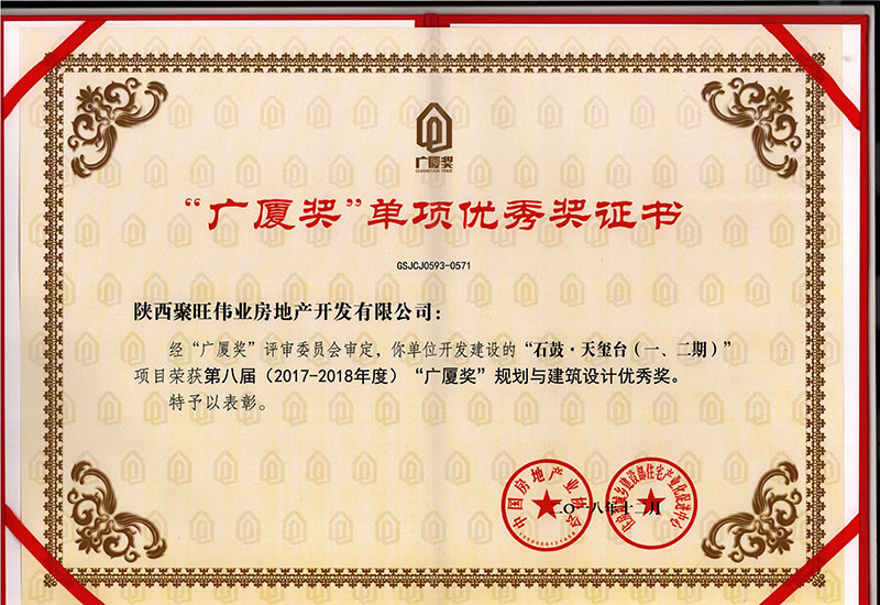 2018年12月25日,第八届中国房地产"广厦奖"颁奖典礼在北京隆重举行,聚旺集团石鼓·天玺台荣获广厦奖杯及两个单项优秀奖,同时集团董事长赵岗先生作为中国房地产协会第八届理事候选人参加了本次 “广厦奖”颁奖仪式。
